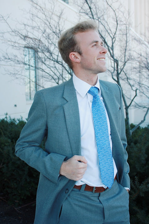A crisp blue tie accented with subtle white flowers. Harbor Bloom is calm, classic, and easy to style for any occasion.